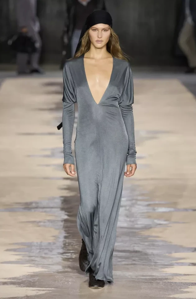 Весною-літом 2026 сірий буде аж ніяк не нудним. П’ятдесят відтінків пастельного сірого, виконаних на тюлю та шовку й зібраних у драпірування. Цей колір раптово стане гідним червоної доріжки. Єдине правило — не чекайте від нього блиску.