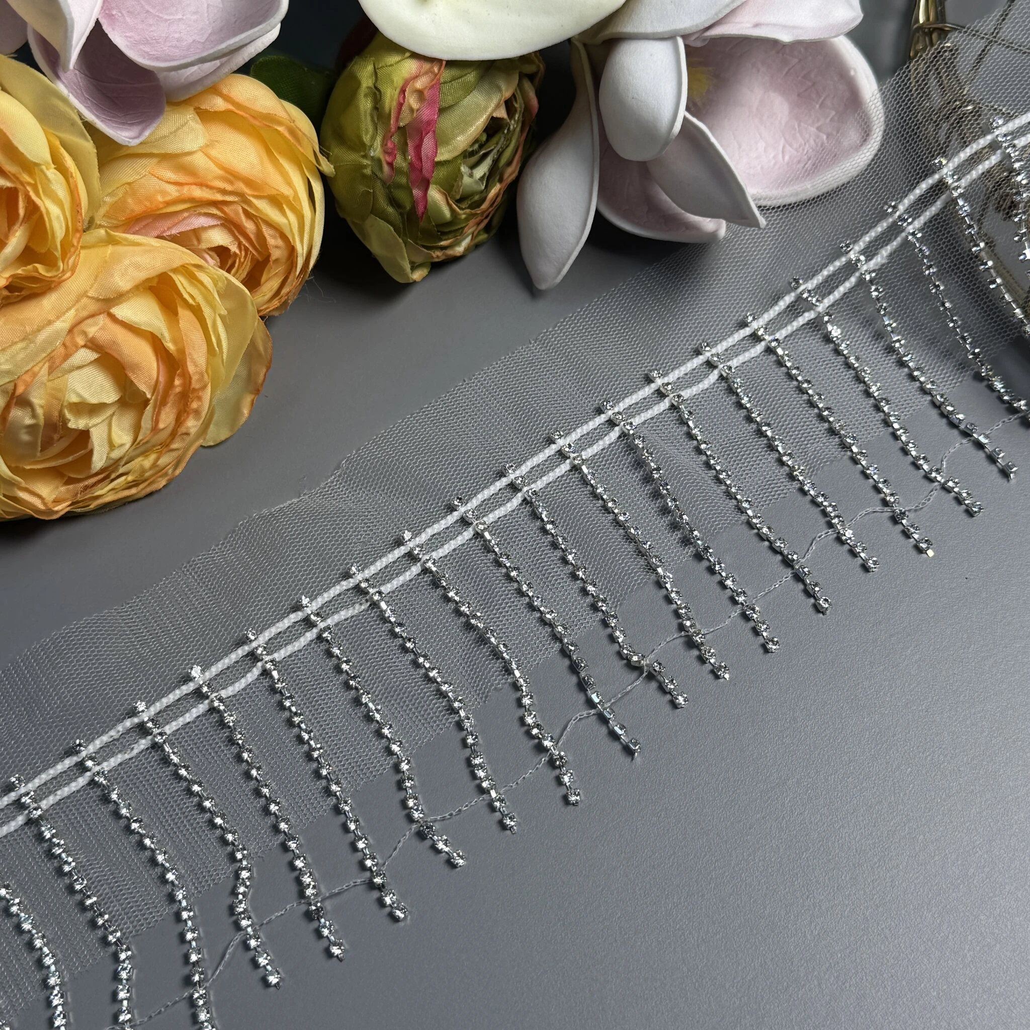 Це декоративна тасьма з підвішеними камінчиками, яка красиво переливається та додає виробам розкішного вигляду. Ідеальна для створення яскравих акцентів і сценічного ефекту.