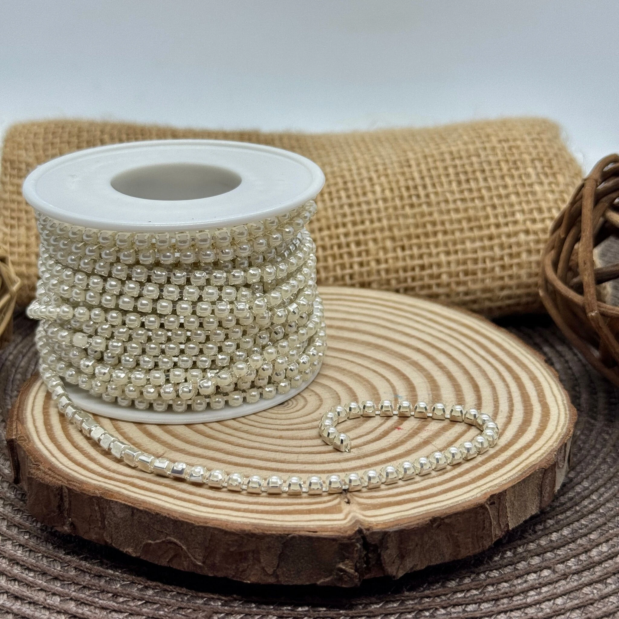 Цепи з каменями SS12 (3 мм) перлина – декоративні металеві ланцюжки з вбудованими перлинними камінцями діаметром 3 мм, які створюють елегантний і блискучий ефект. Вони ідеально підходять для прикрашання одягу, аксесуарів та декоративних виробів, додаючи виробам витонченості та святкового вигляду.