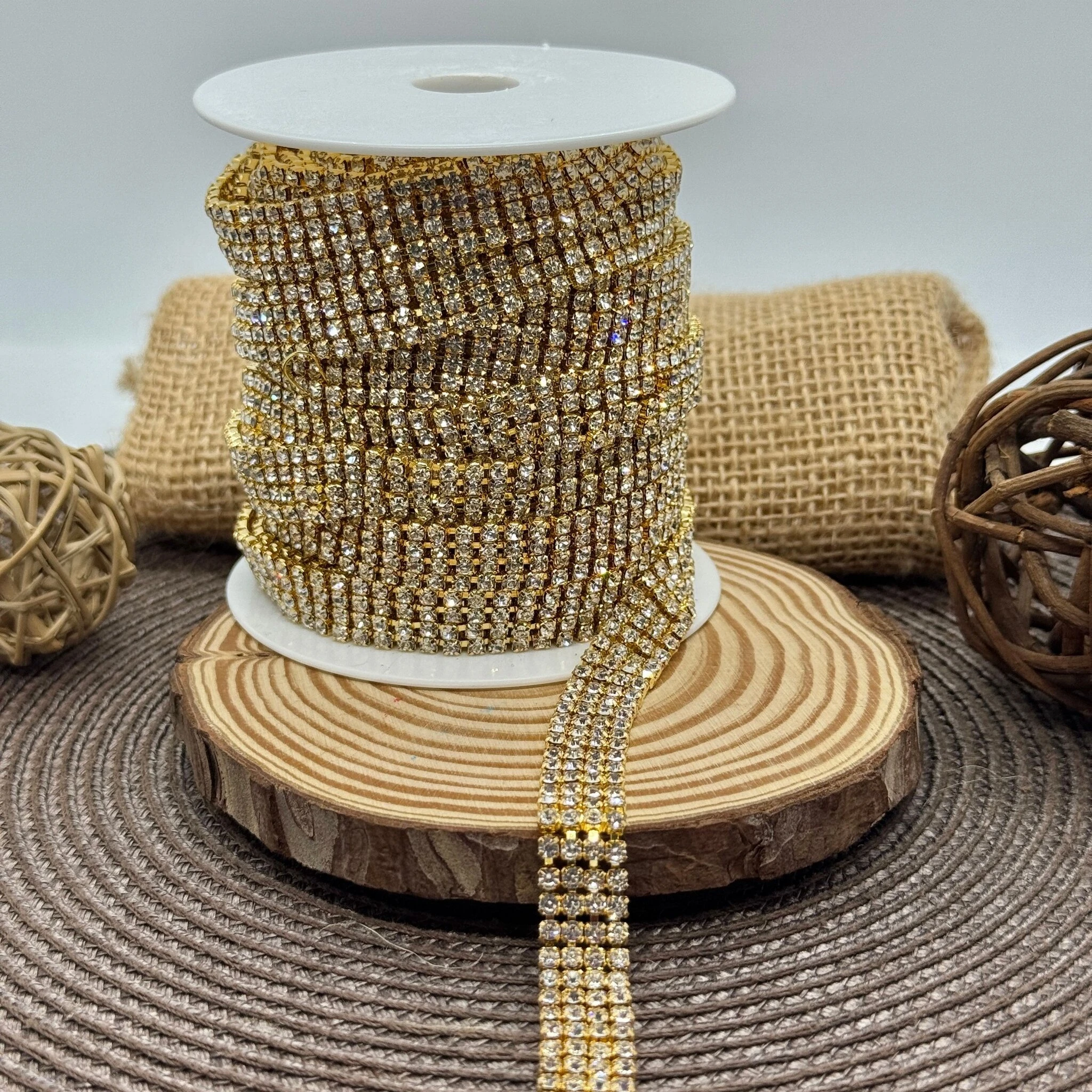 Цепи з каменями SS12, 4 ряди, 3 мм, 10 ярдів – декоративна металева стрічка з чотирма рядами блискучих камінців діаметром 3 мм. Ідеально підходить для прикрашання одягу, аксесуарів та хендмейд виробів, створюючи насичений блиск і виразний декоративний ефект.