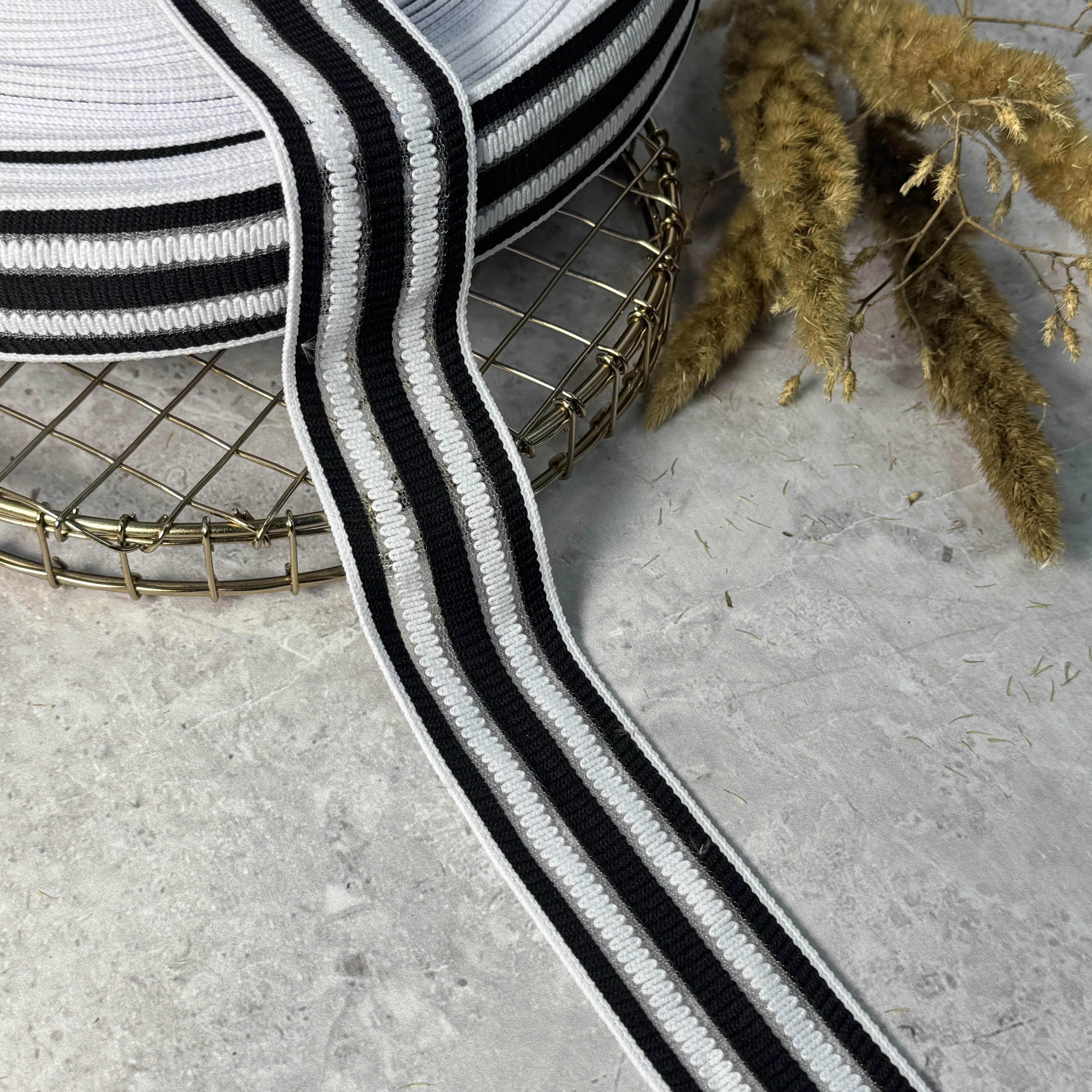 Лампас трикотажний 4 см «зіг-заг»(50 м), чорний+білий підійде для пошиття одягу, декору, білизни, аксесуарів та творчих проєктів. Допоможемо з підбором суміжних позицій і кольорів.