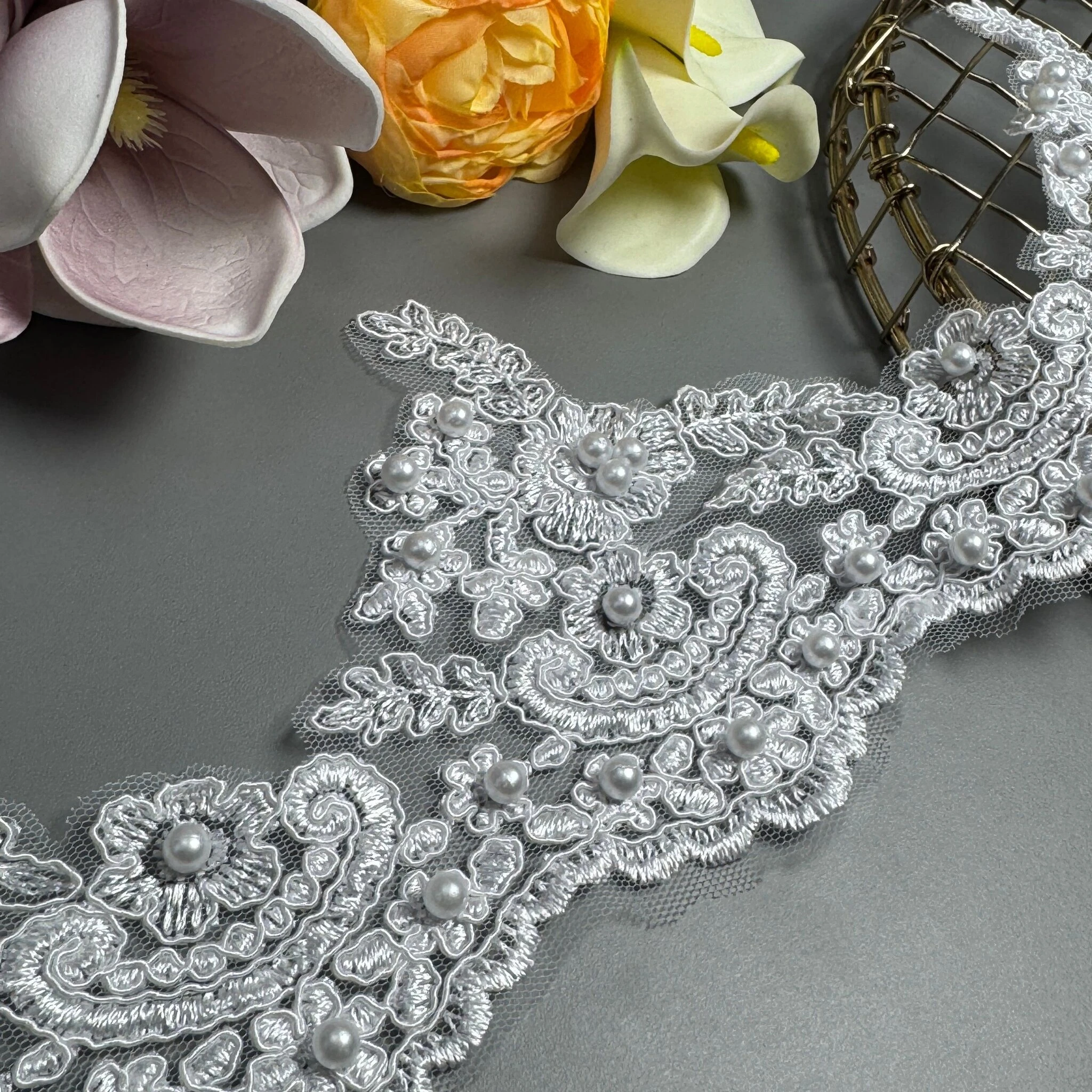 Мережево з кордовую ниткою Т600009А+перли 12 см. (16 ярдів/14.6 м.), білий