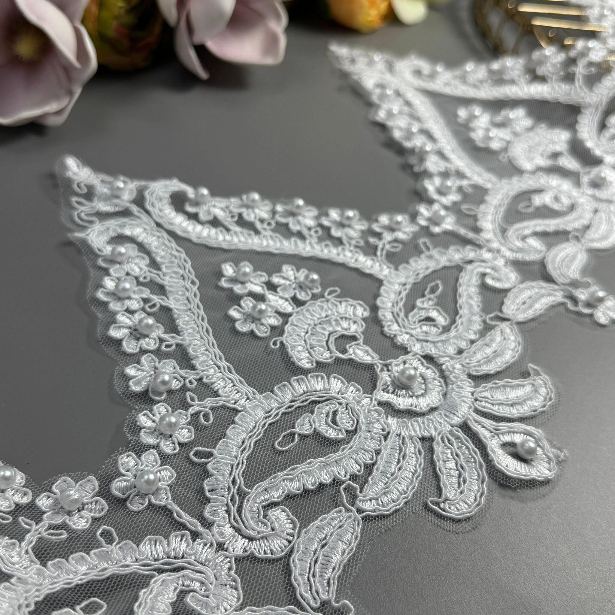 Мереживо з кордовою ниткою – це вишуканий матеріал, у якому ніжний візерунок додатково підкреслений тонкою рельєфною ниткою. Завдяки цьому мереживо виглядає більш об’ємним, фактурним та елегантним.