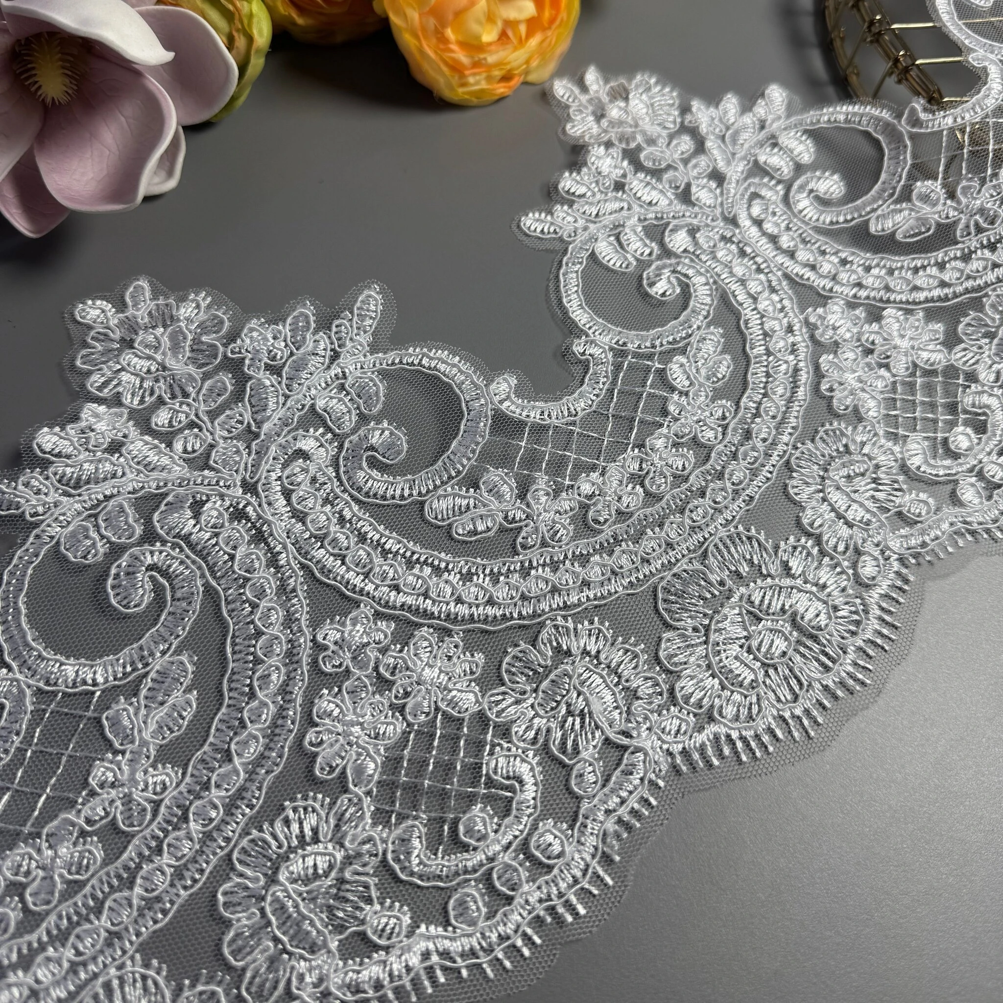 Мереживо чудово підходить для оздоблення подолу, рукавів, ліфа весільних і вечірніх суконь, а також для декору вуалей, шлейфів чи фати. Воно може стати акцентом у сценічних костюмах, святкових аксесуарах та предметах інтер’єру, наприклад, у декоративному текстилі.