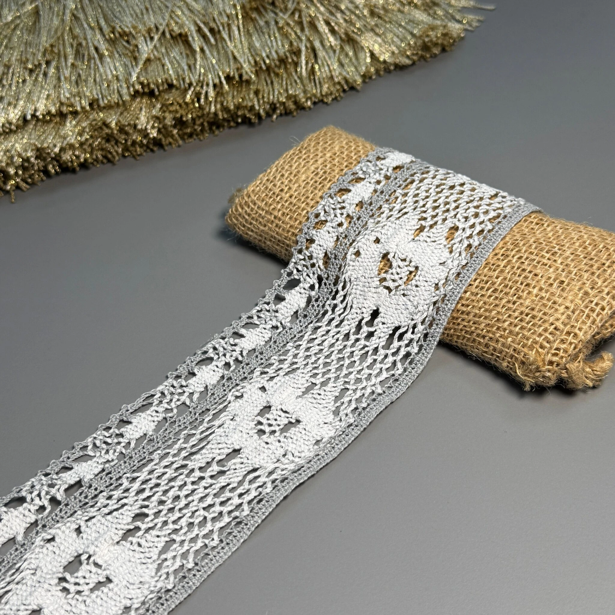 Мереживо макраме 8609 8 см (100 ярдів/91,4 м.), сірий+білий