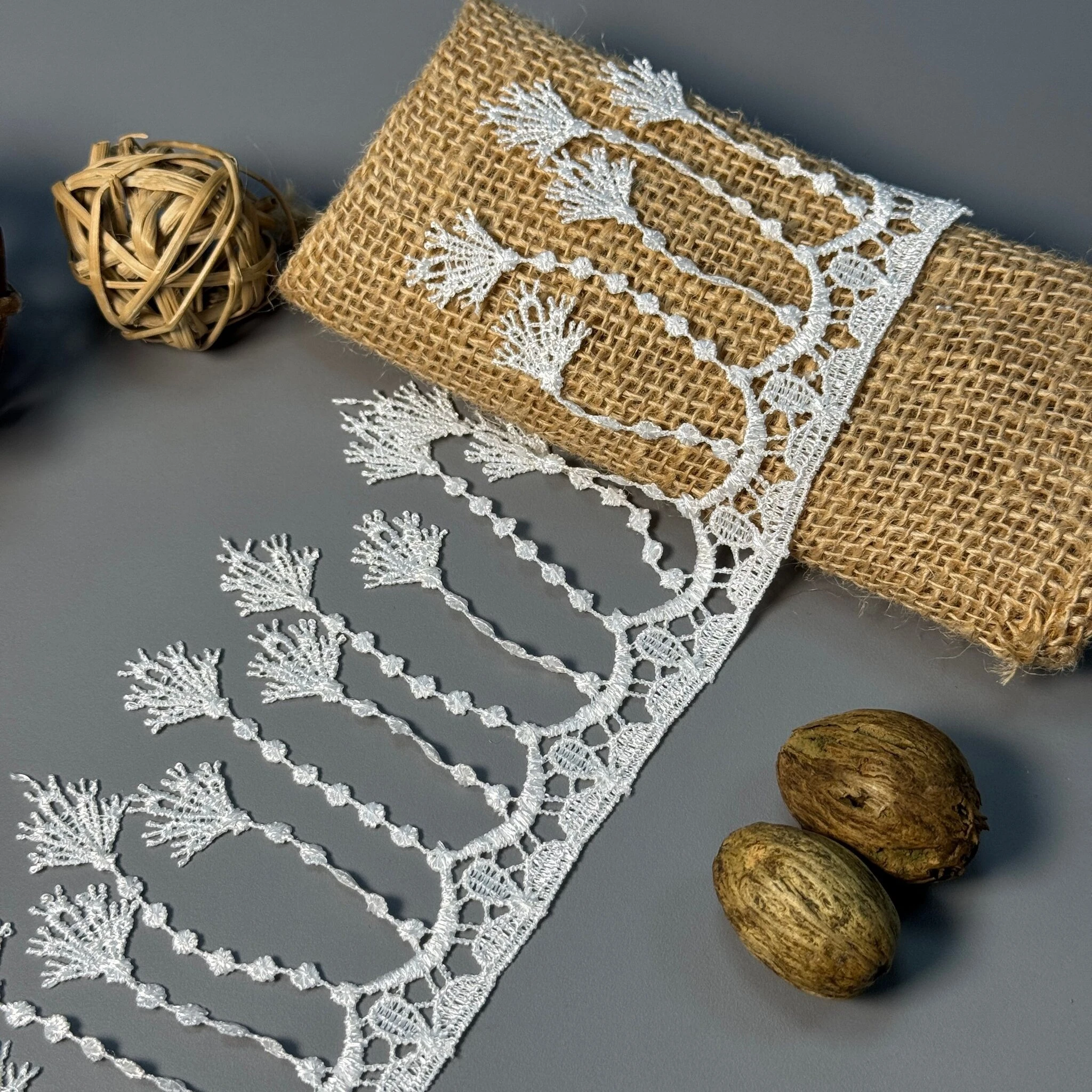 Мереживо поліестер – декоративний матеріал з синтетичного волокна, що відзначається високою зносостійкістю та стабільністю форми. Поліестер не схильний до деформацій, не розтягується і не мнеться, що робить мереживо придатним для частого використання.