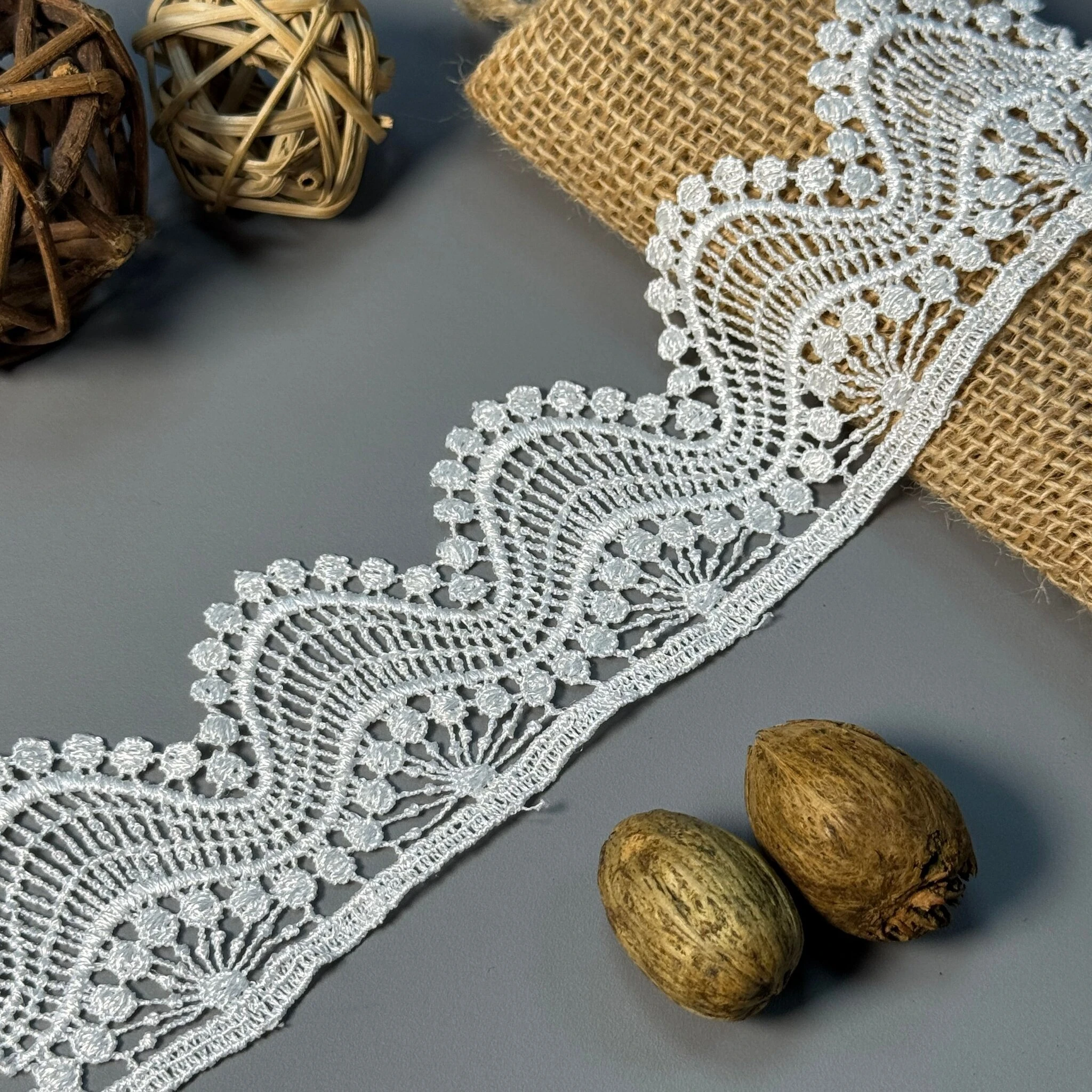 Мереживо поліестер – декоративний матеріал з синтетичного волокна, що відзначається високою зносостійкістю та стабільністю форми. Поліестер не схильний до деформацій, не розтягується і не мнеться, що робить мереживо придатним для частого використання.