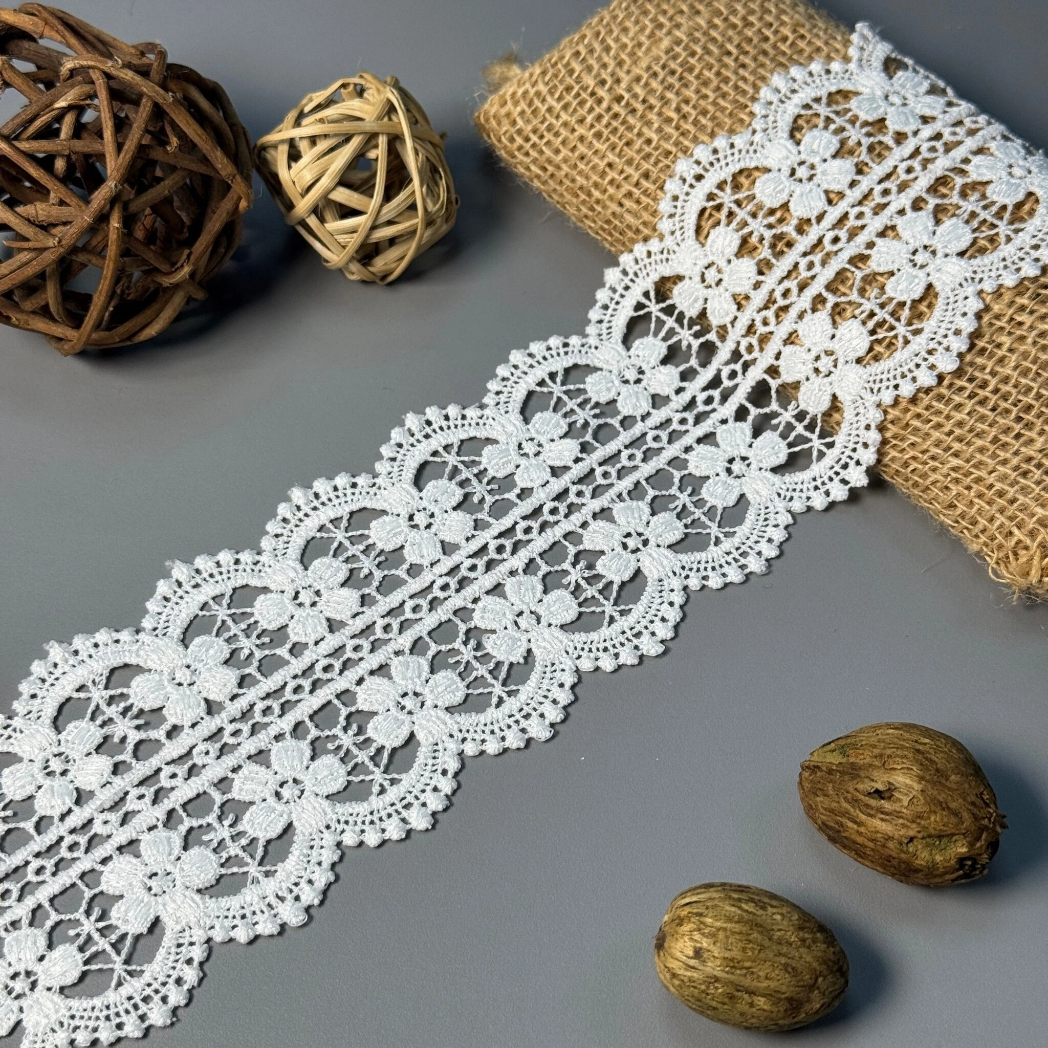 Мереживо поліестер – декоративний матеріал з синтетичного волокна, що відзначається високою зносостійкістю та стабільністю форми. Поліестер не схильний до деформацій, не розтягується і не мнеться, що робить мереживо придатним для частого використання.