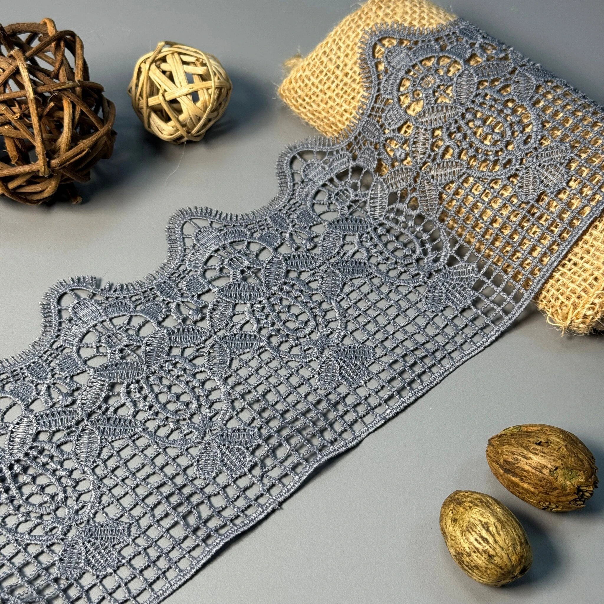 Мереживо поліестер – декоративний матеріал з синтетичного волокна, що відзначається високою зносостійкістю та стабільністю форми. Поліестер не схильний до деформацій, не розтягується і не мнеться, що робить мереживо придатним для частого використання.