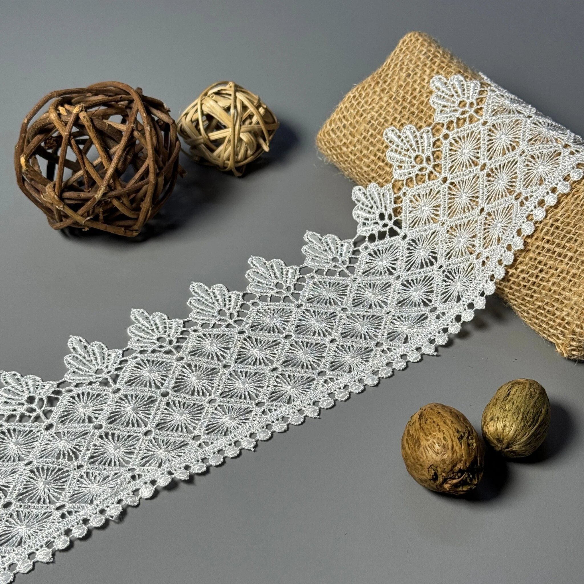 Мереживо поліестер – декоративний матеріал з синтетичного волокна, що відзначається високою зносостійкістю та стабільністю форми. Поліестер не схильний до деформацій, не розтягується і не мнеться, що робить мереживо придатним для частого використання.