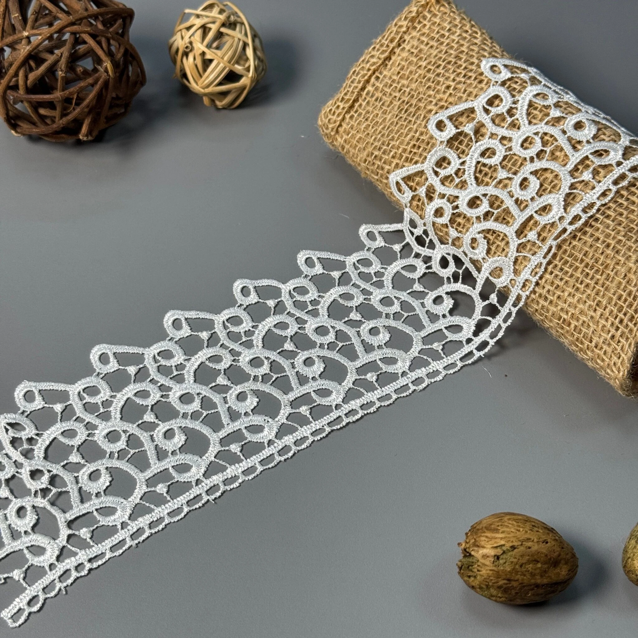 Мереживо поліестер – декоративний матеріал з синтетичного волокна, що відзначається високою зносостійкістю та стабільністю форми. Поліестер не схильний до деформацій, не розтягується і не мнеться, що робить мереживо придатним для частого використання.