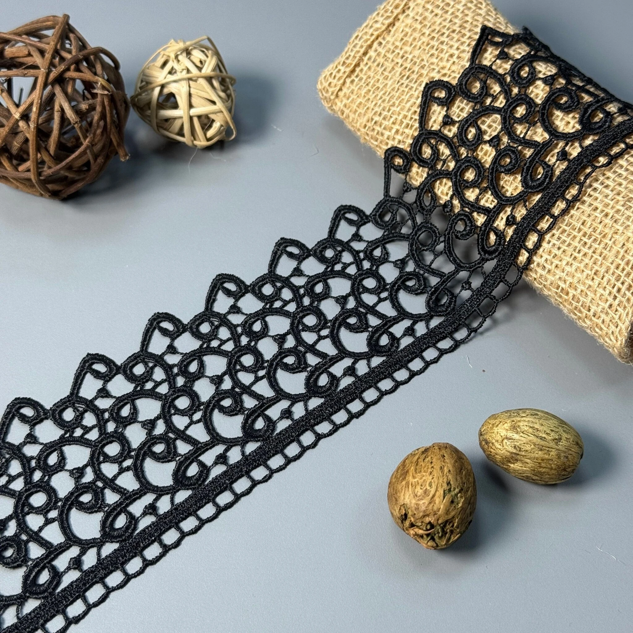 Мереживо поліестер – декоративний матеріал з синтетичного волокна, що відзначається високою зносостійкістю та стабільністю форми. Поліестер не схильний до деформацій, не розтягується і не мнеться, що робить мереживо придатним для частого використання.