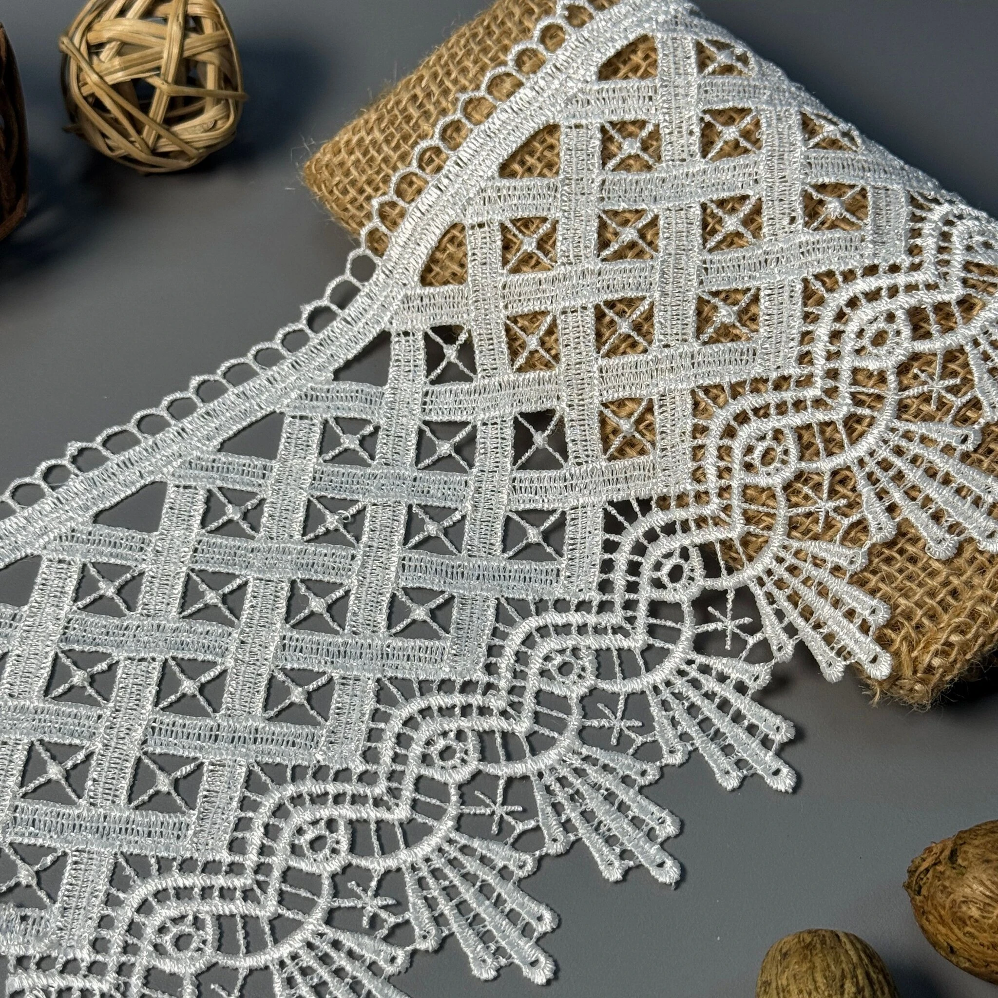 Мереживо поліестер – декоративний матеріал з синтетичного волокна, що відзначається високою зносостійкістю та стабільністю форми. Поліестер не схильний до деформацій, не розтягується і не мнеться, що робить мереживо придатним для частого використання.