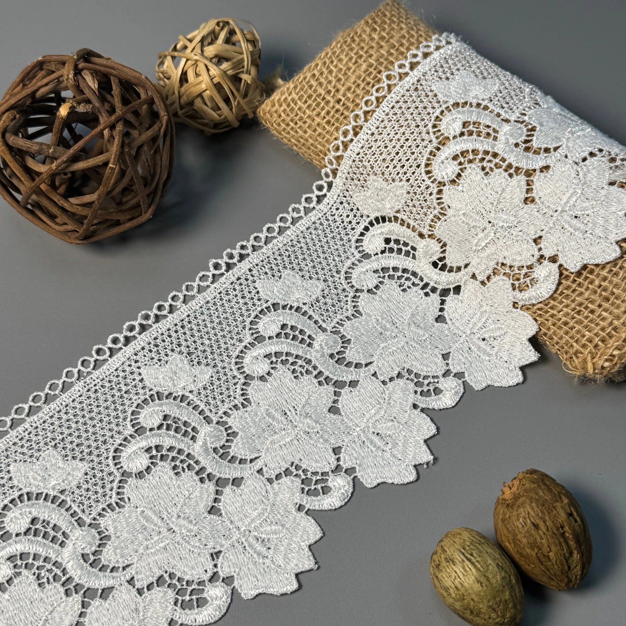Мереживо поліестер – декоративний матеріал з синтетичного волокна, що відзначається високою зносостійкістю та стабільністю форми. Поліестер не схильний до деформацій, не розтягується і не мнеться, що робить мереживо придатним для частого використання.