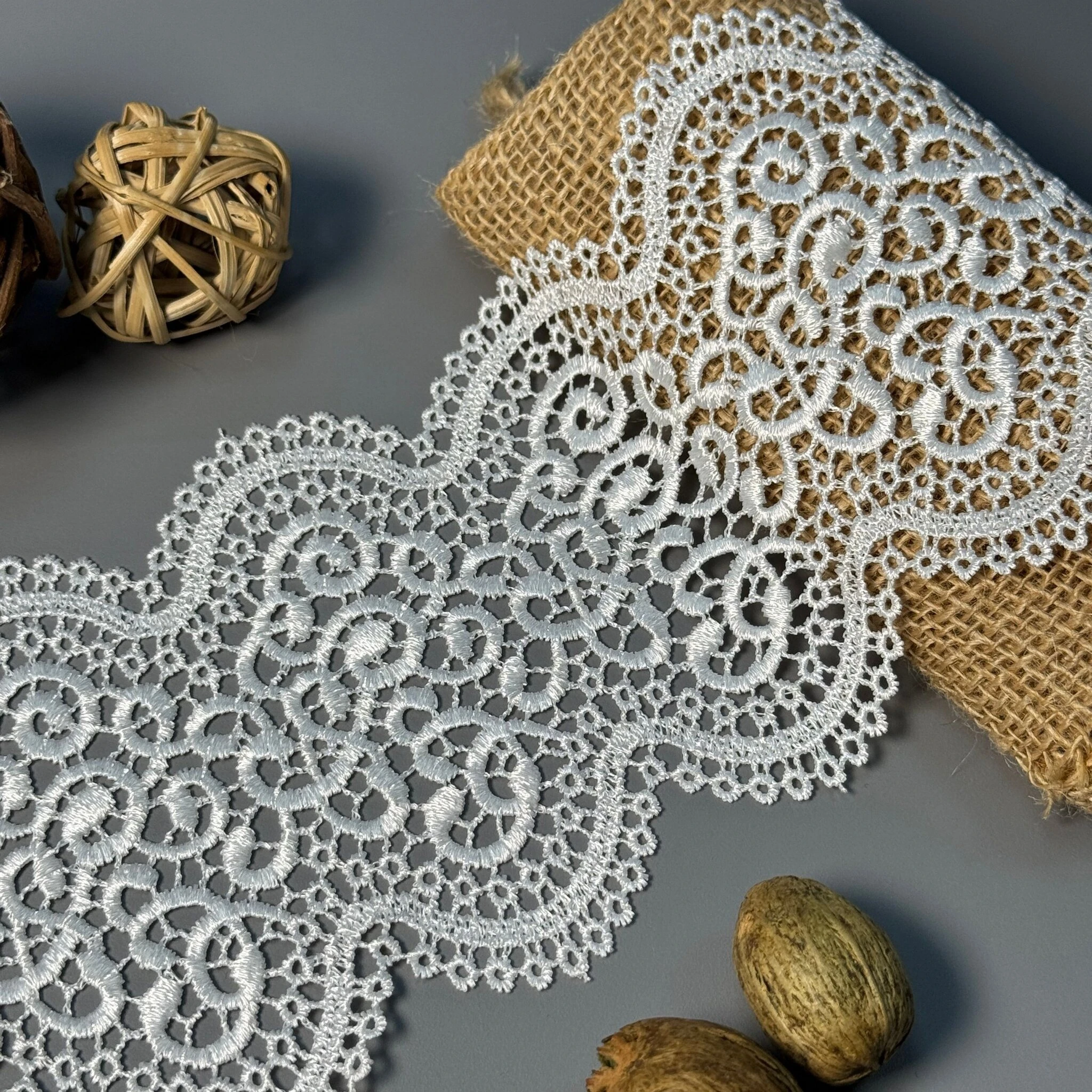 Мереживо поліестер – декоративний матеріал з синтетичного волокна, що відзначається високою зносостійкістю та стабільністю форми. Поліестер не схильний до деформацій, не розтягується і не мнеться, що робить мереживо придатним для частого використання.
