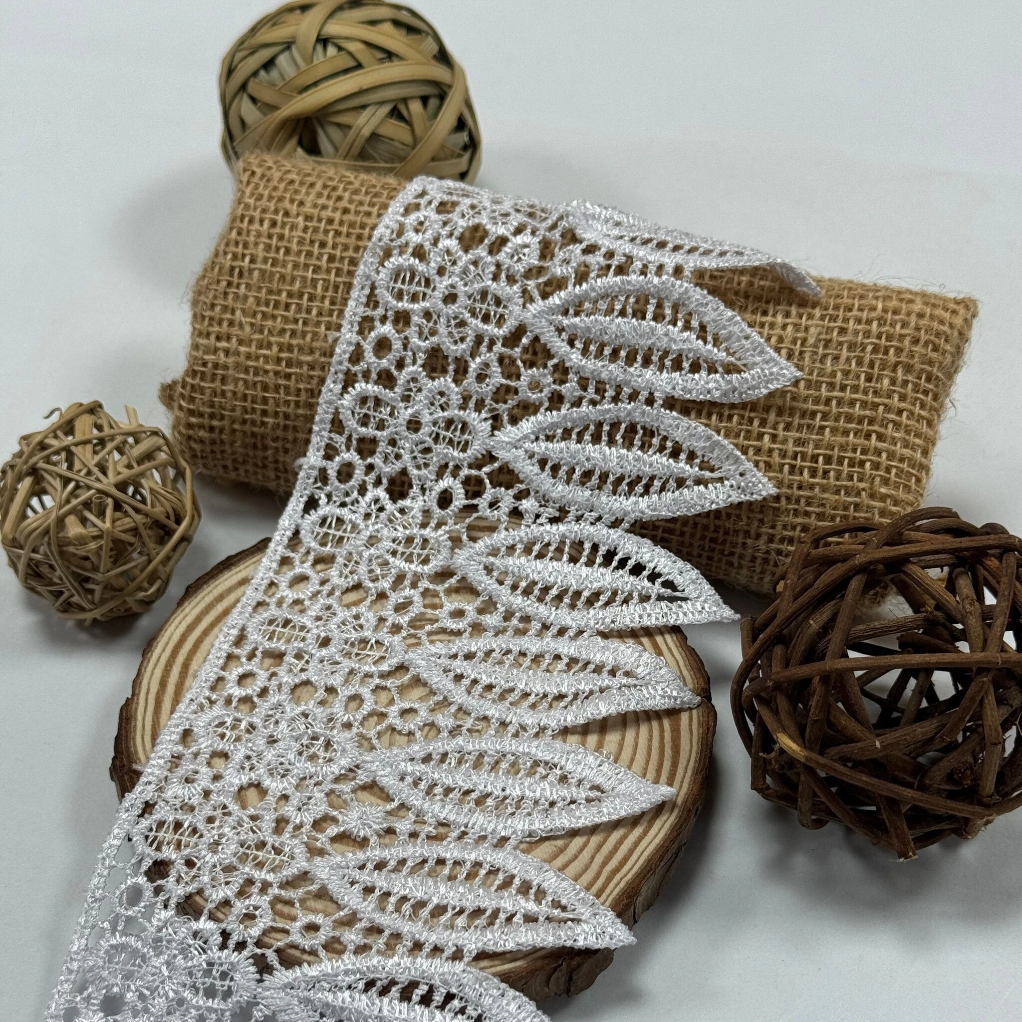 Мереживо поліестер – декоративний матеріал з синтетичного волокна, що відзначається високою зносостійкістю та стабільністю форми. Поліестер не схильний до деформацій, не розтягується і не мнеться, що робить мереживо придатним для частого використання.