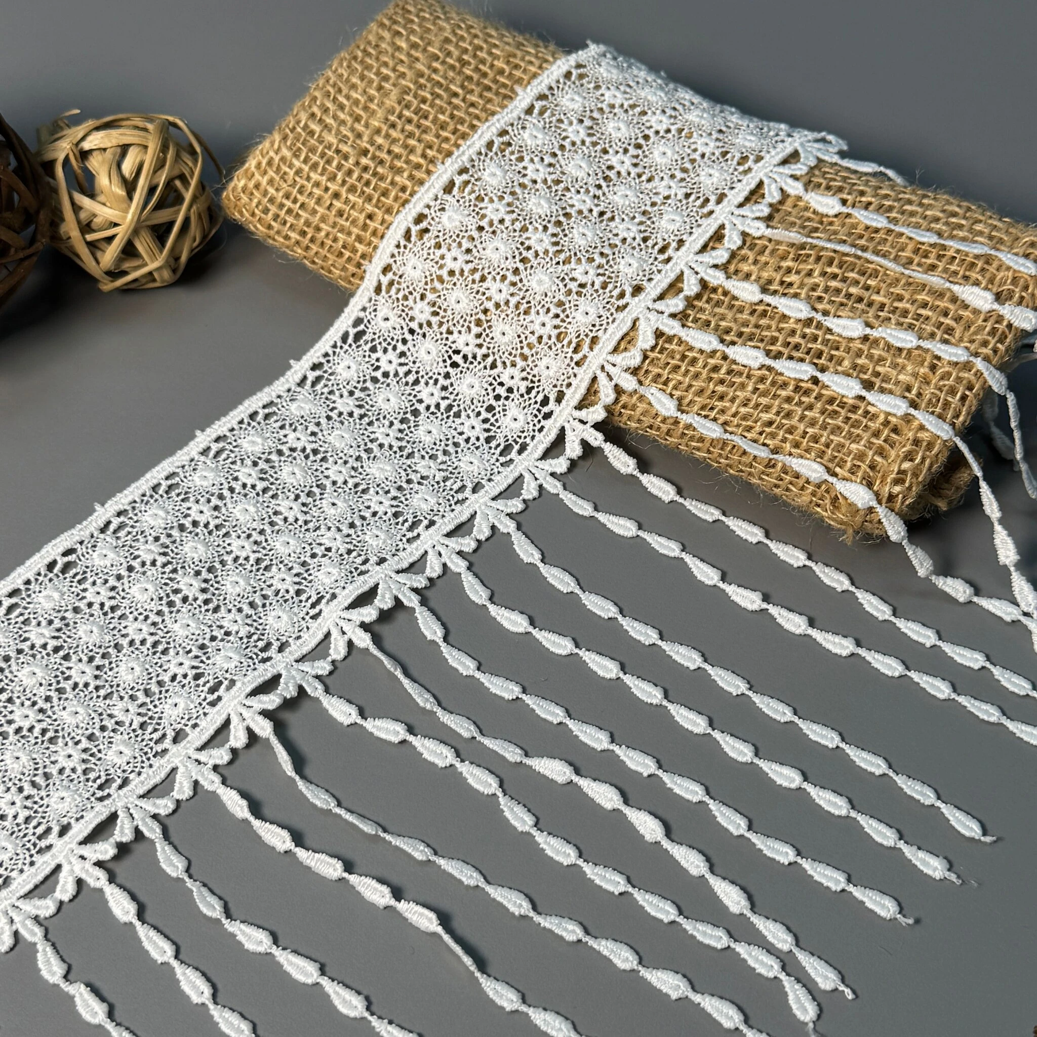 Мереживо поліестер – декоративний матеріал з синтетичного волокна, що відзначається високою зносостійкістю та стабільністю форми. Поліестер не схильний до деформацій, не розтягується і не мнеться, що робить мереживо придатним для частого використання.