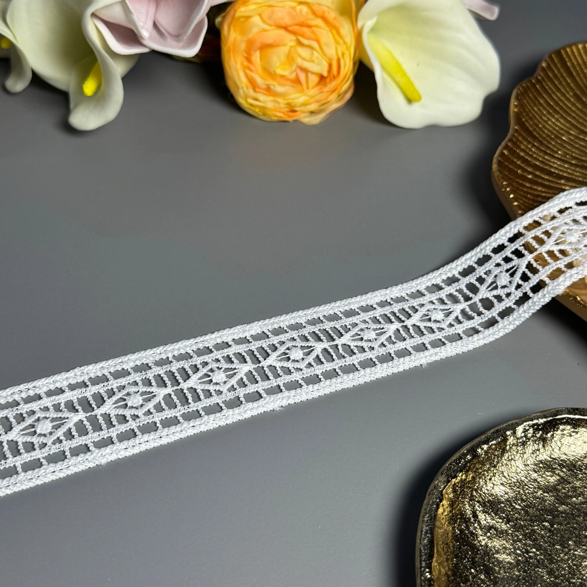 Мереживо поліестер – декоративний матеріал з синтетичного волокна, що відзначається високою зносостійкістю та стабільністю форми. Поліестер не схильний до деформацій, не розтягується і не мнеться, що робить мереживо придатним для частого використання.