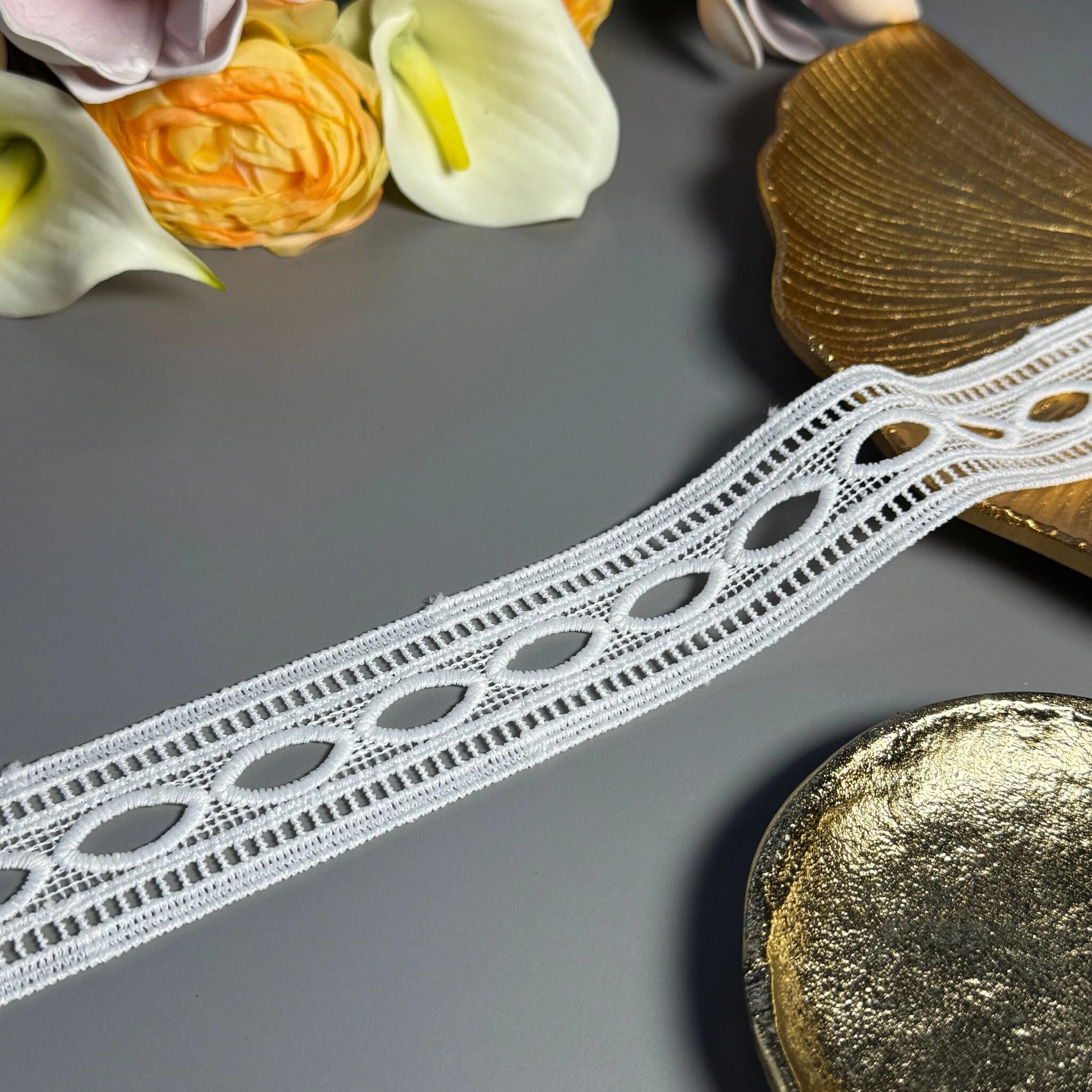 Мереживо поліестер – декоративний матеріал з синтетичного волокна, що відзначається високою зносостійкістю та стабільністю форми. Поліестер не схильний до деформацій, не розтягується і не мнеться, що робить мереживо придатним для частого використання.