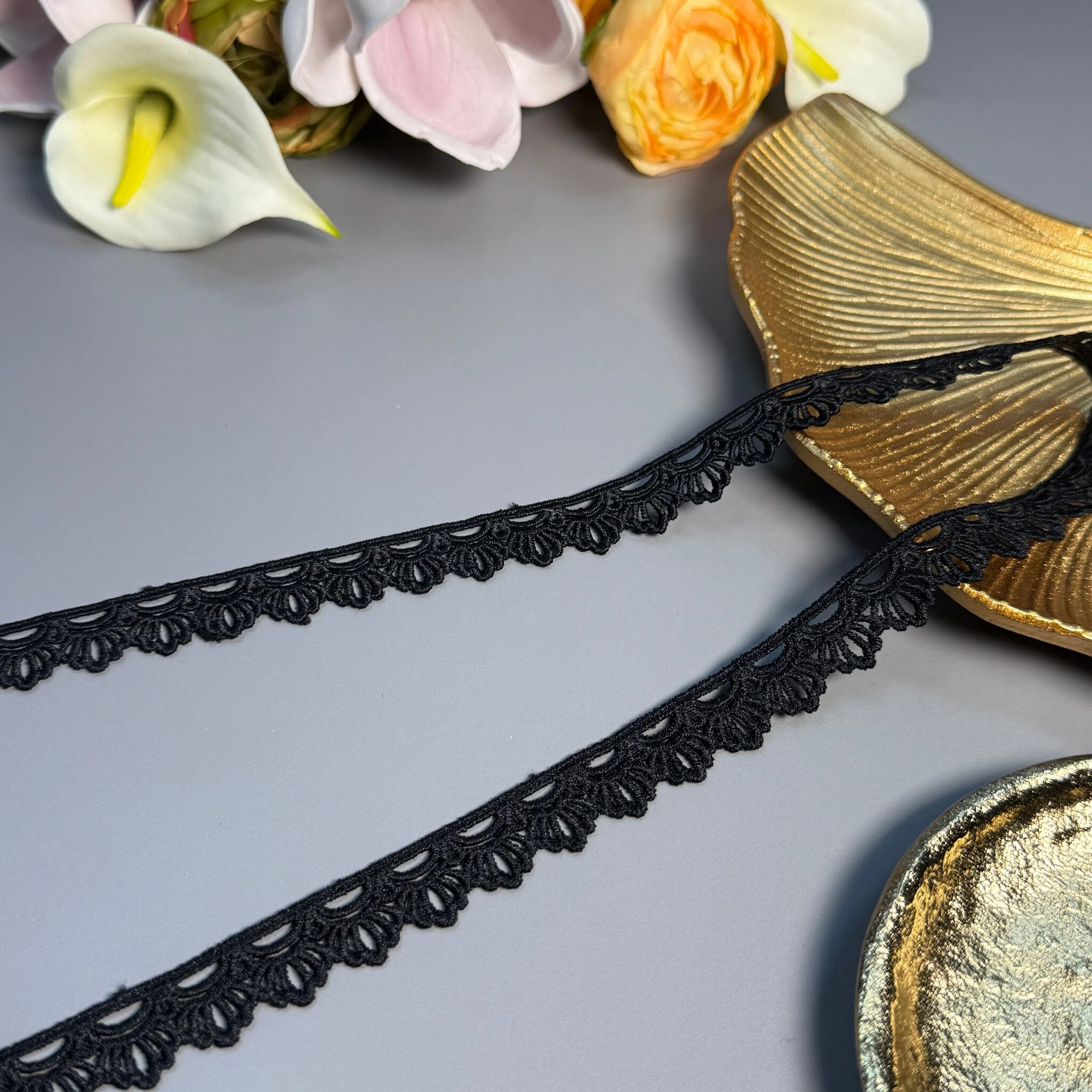Мереживо поліестер – декоративний матеріал з синтетичного волокна, що відзначається високою зносостійкістю та стабільністю форми. Поліестер не схильний до деформацій, не розтягується і не мнеться, що робить мереживо придатним для частого використання.