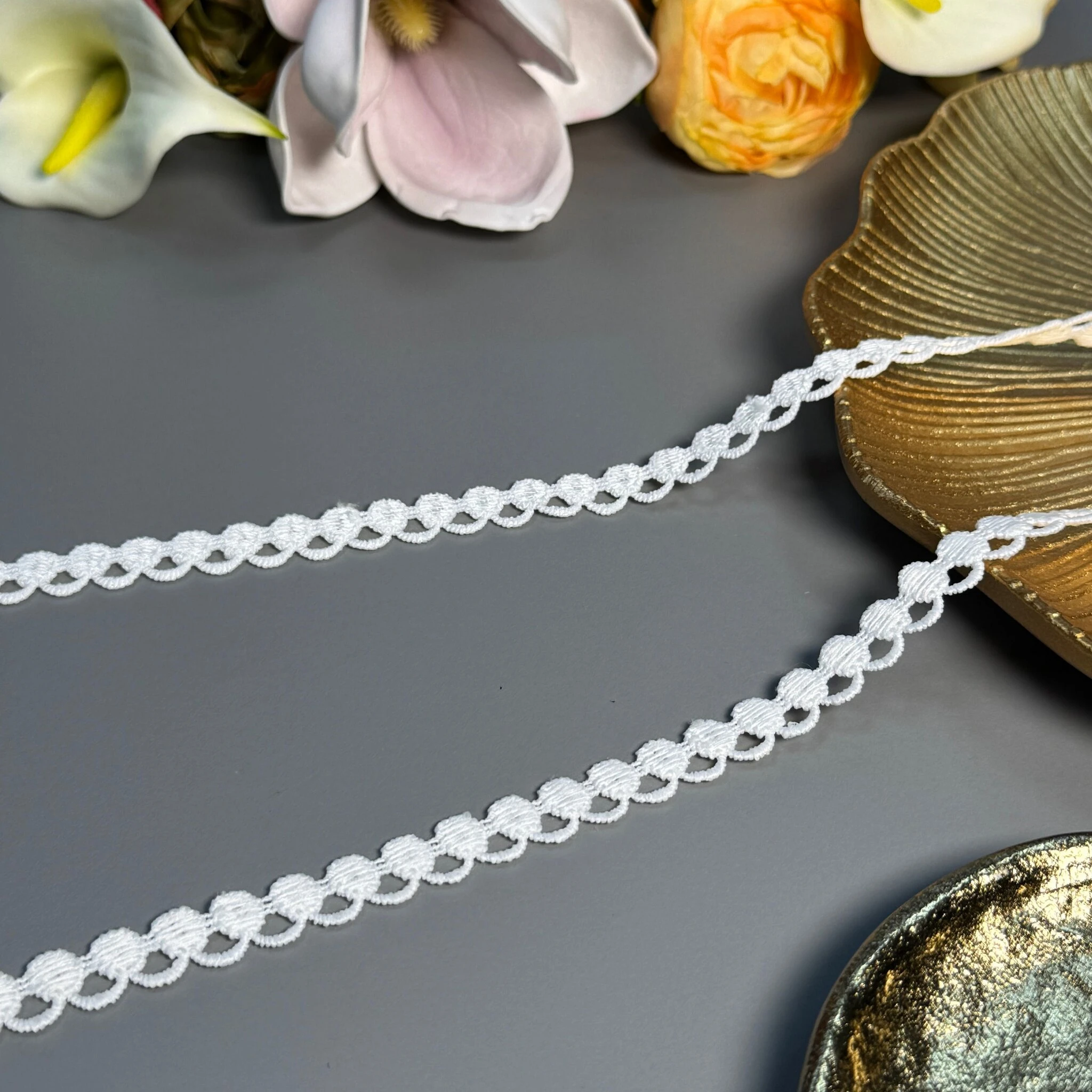 Мереживо поліестер – декоративний матеріал з синтетичного волокна, що відзначається високою зносостійкістю та стабільністю форми. Поліестер не схильний до деформацій, не розтягується і не мнеться, що робить мереживо придатним для частого використання.