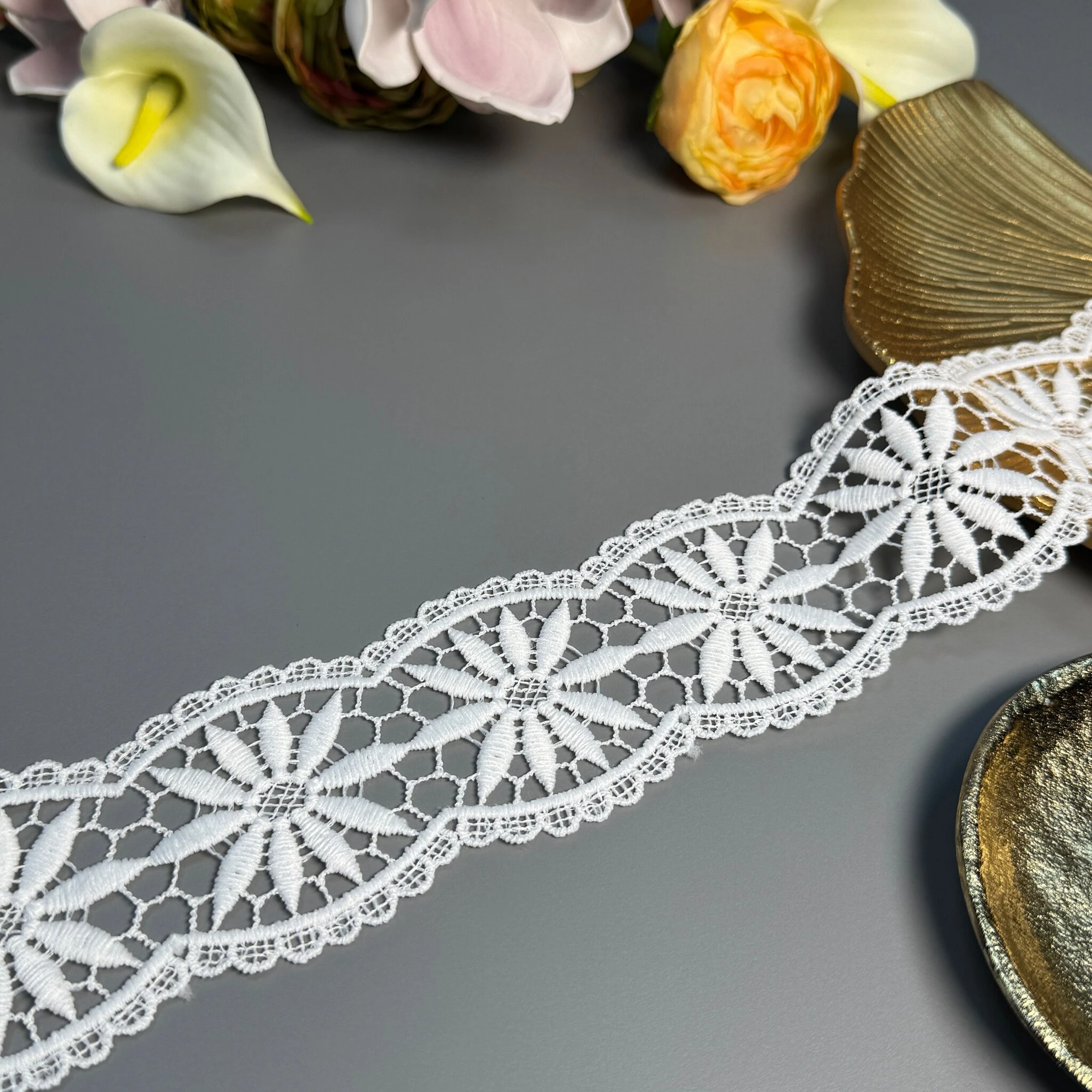 Мереживо поліестер – декоративний матеріал з синтетичного волокна, що відзначається високою зносостійкістю та стабільністю форми. Поліестер не схильний до деформацій, не розтягується і не мнеться, що робить мереживо придатним для частого використання.