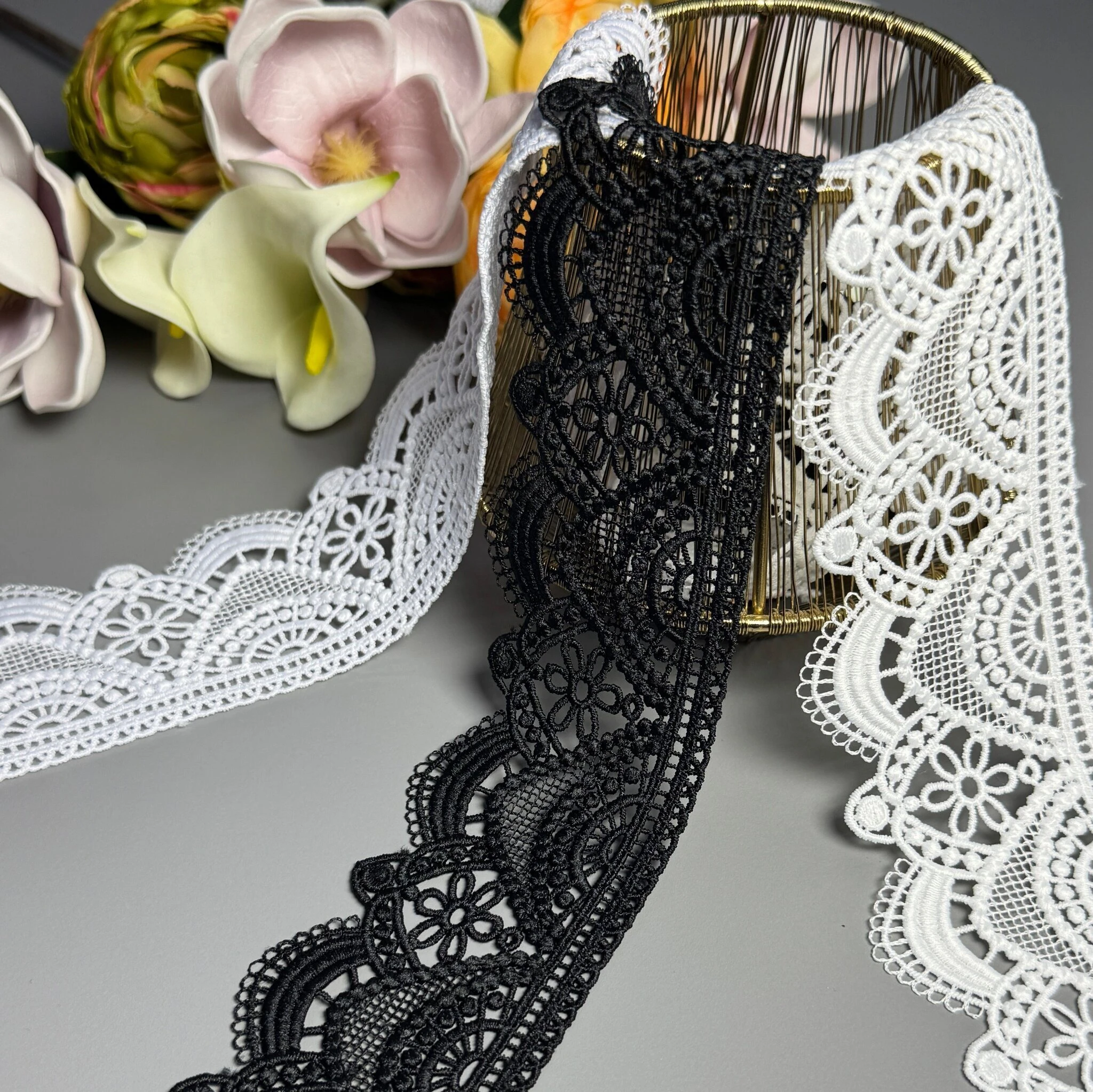 Мереживо поліестер – декоративний матеріал з синтетичного волокна, що відзначається високою зносостійкістю та стабільністю форми. Поліестер не схильний до деформацій, не розтягується і не мнеться, що робить мереживо придатним для частого використання.
