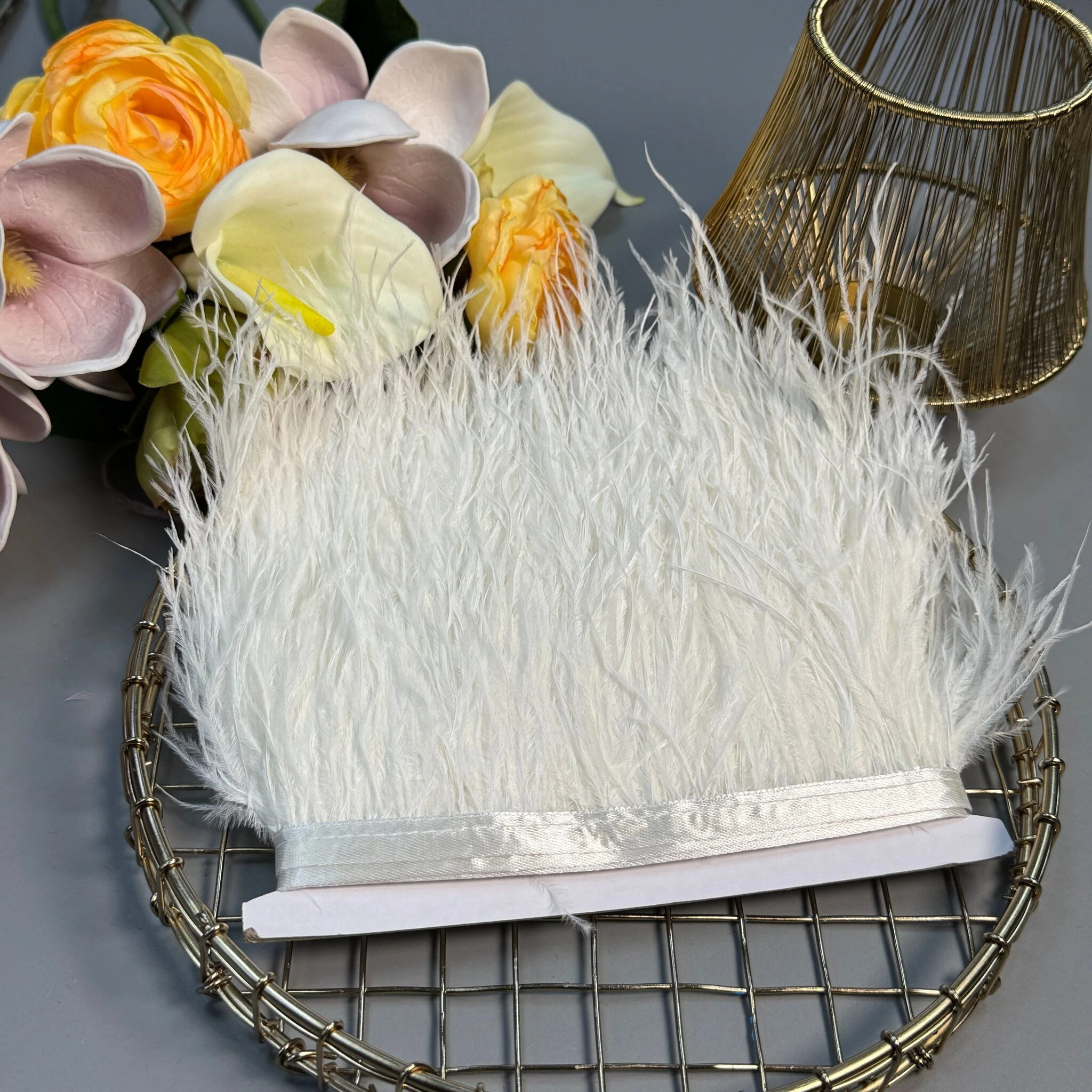 Пір’я на тасьмі 7–10 см, 10 метрів – декоративна стрічка з натуральними або штучними пір’ям довжиною 7–10 см, змонтованими на текстильній основі.
