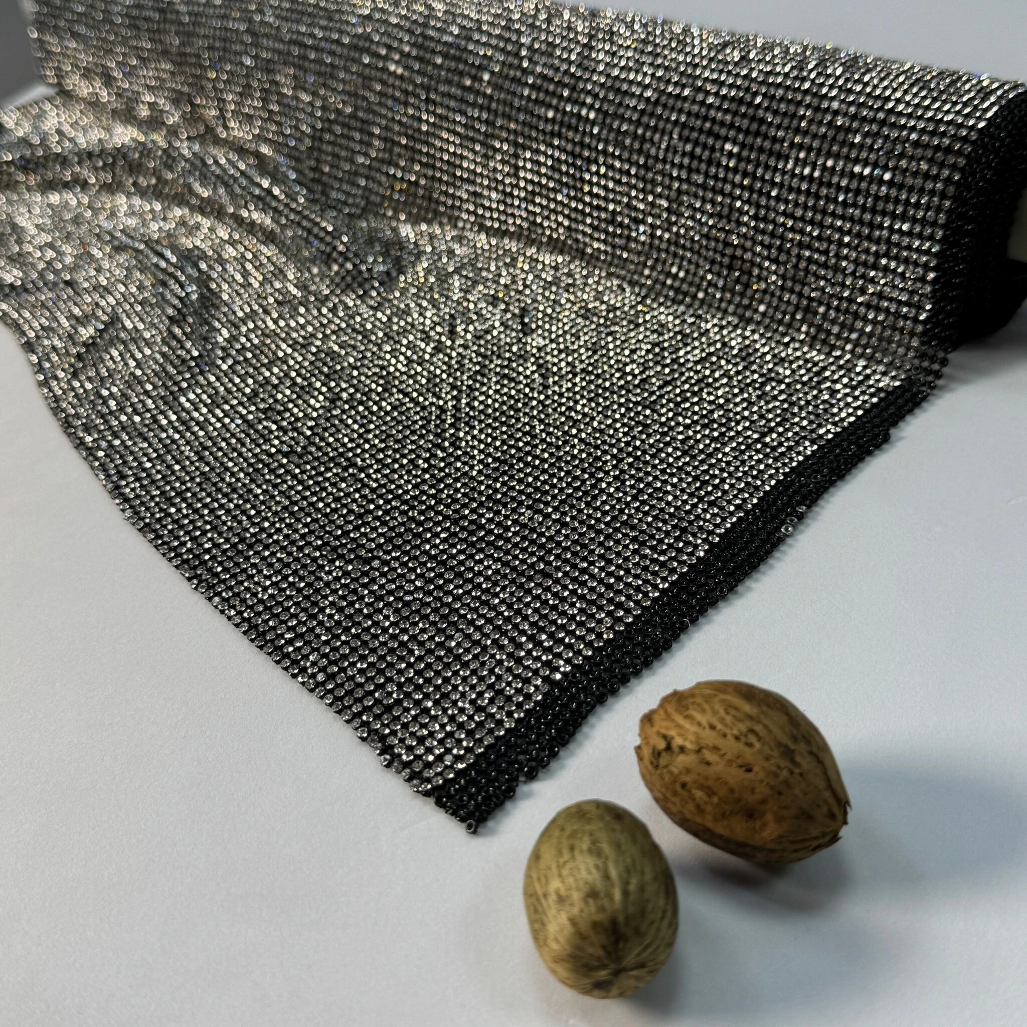 Стрази полотно пришив 36×120 см – декоративний матеріал, покритий блискучими камінцями, який дозволяє швидко та ефектно прикрасити одяг, аксесуари або декоративні вироби. Камені рівномірно розташовані на тканині, створюючи яскравий і святковий блиск.