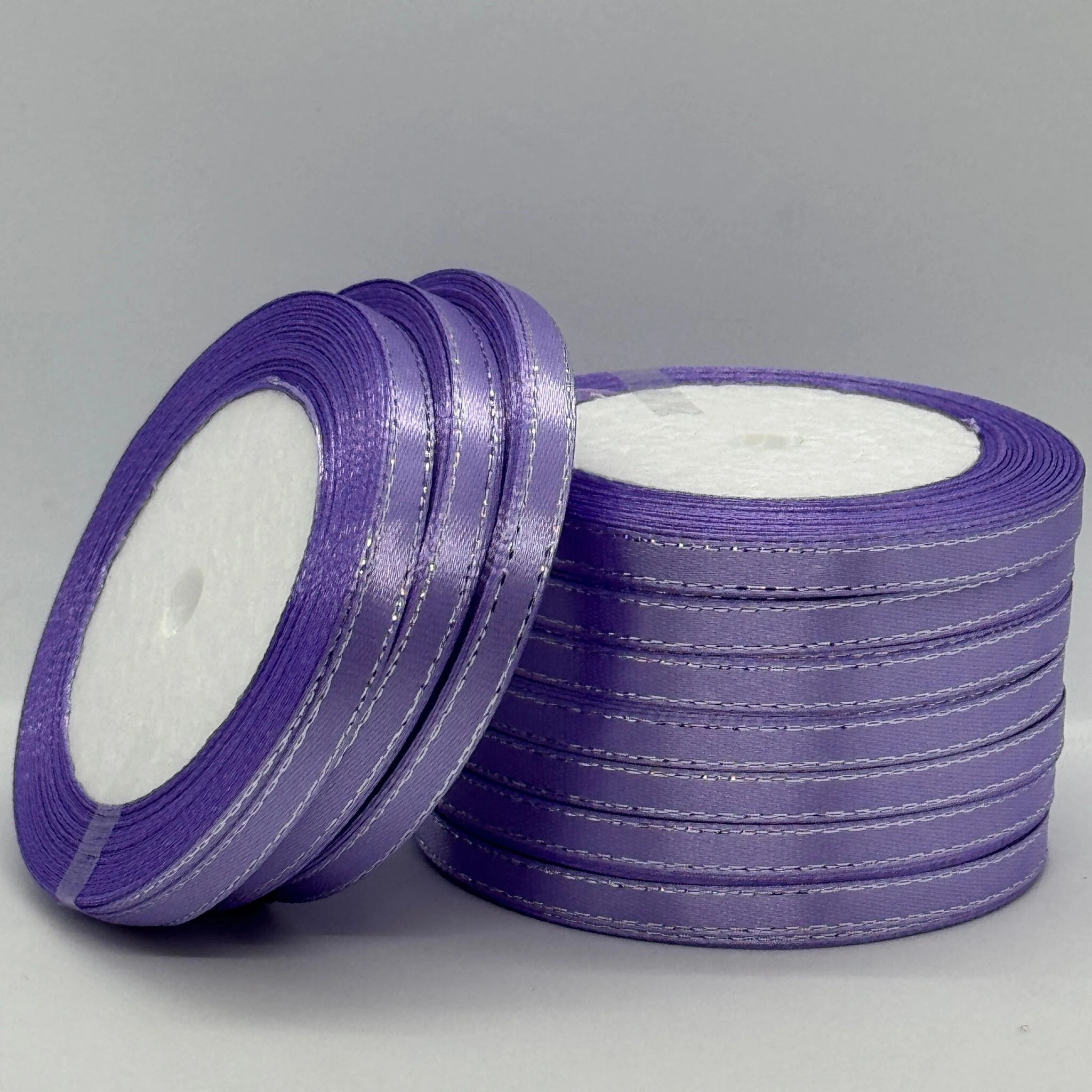Стрічка атласна з люрекс 0,6 см+срібло (10*25 ярдів), 21 фіалковий