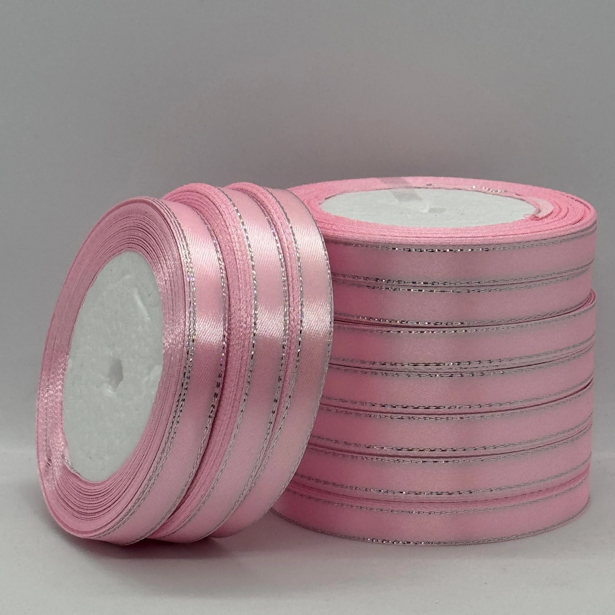 Стрічка атласна з люрекс 1 см+срібло (10*25 ярдів), 04 світло рожевий