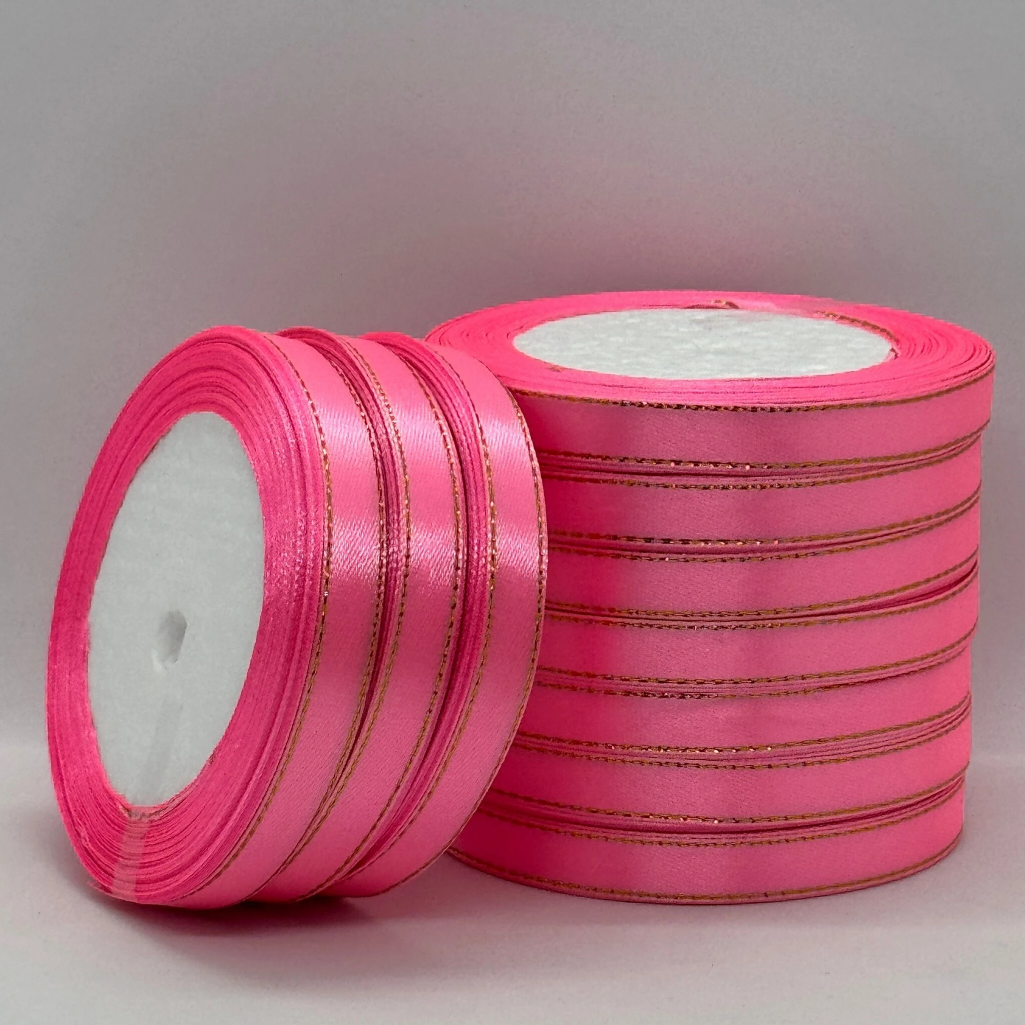 Стрічка атласна з люрекс 1 см+золото (10*25 ярдів), 05 рожевий