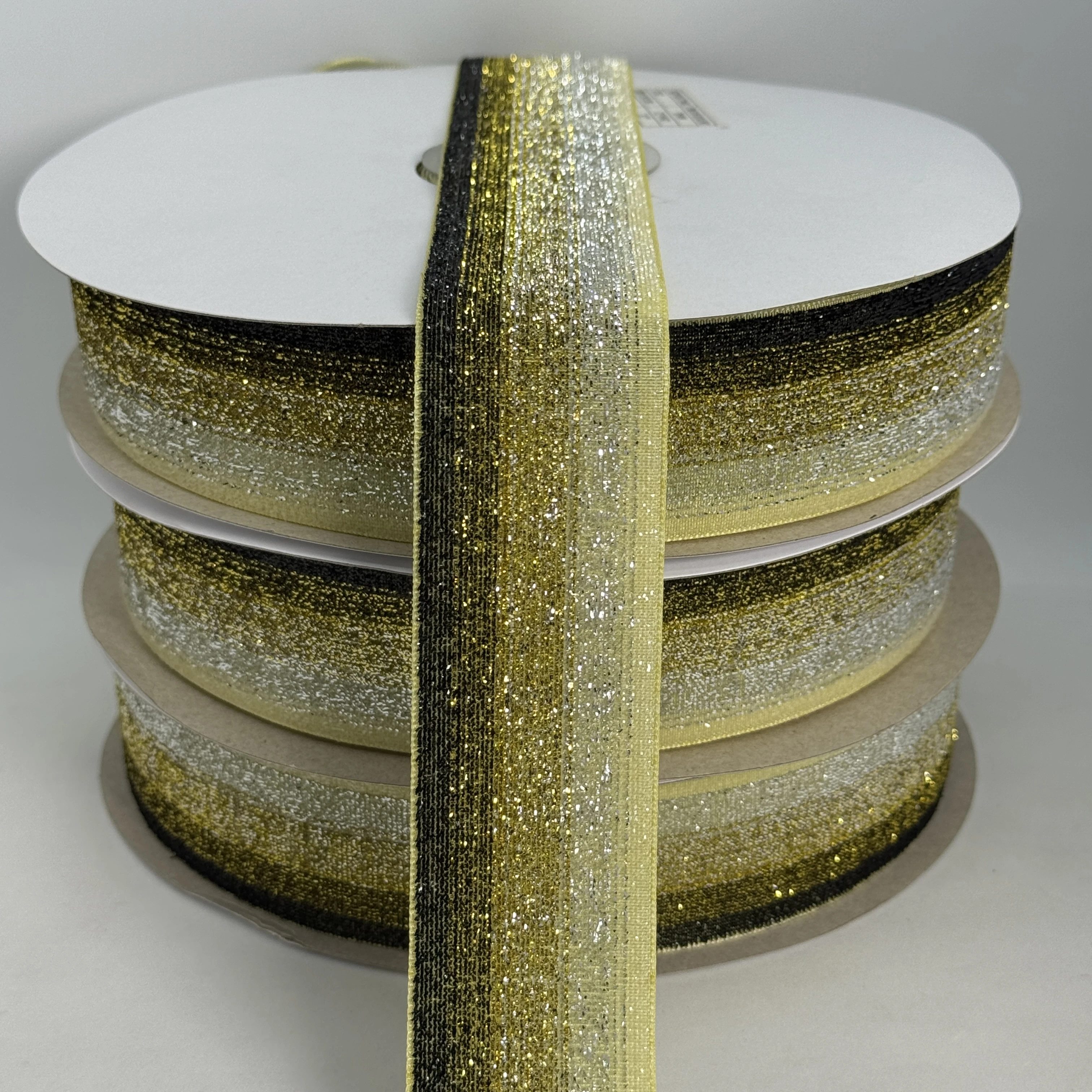 Стрічка оксамитова парча люрекс 3.8 см (25 ярдів/22,75 м.), 33 жовтий + чорний +золото + срібло