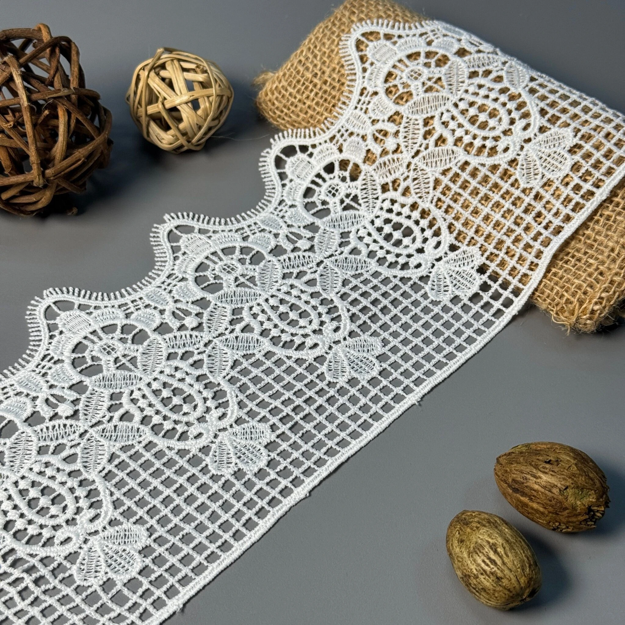 Кружево полиэстер – декоративный материал из синтетического волокна, который отличается высокой износостойкостью и стабильностью формы. Полиэстер не склонен к деформациям, не растягивается и не мнется, что делает кружево подходящим для частого использования.