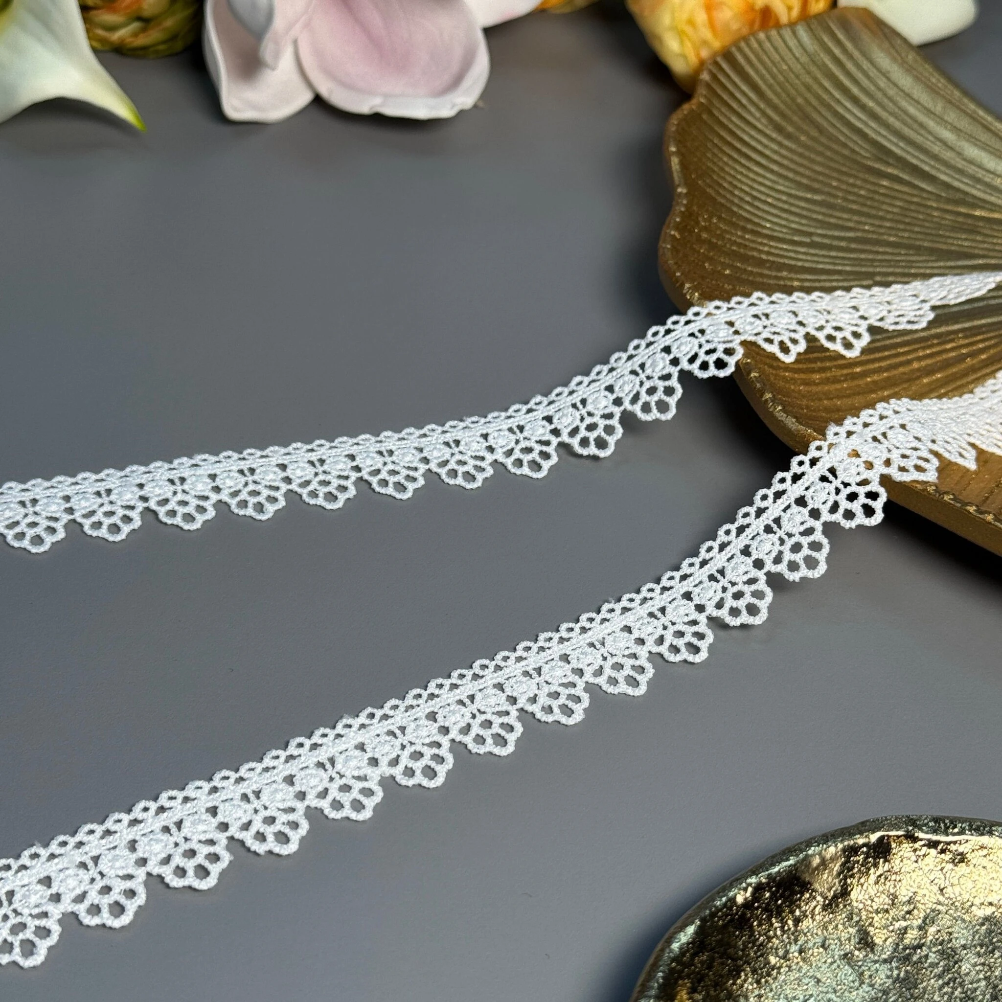 Кружево полиэстер – декоративный материал из синтетического волокна, который отличается высокой износостойкостью и стабильностью формы. Полиэстер не склонен к деформациям, не растягивается и не мнется, что делает кружево пригодным для частого использования.