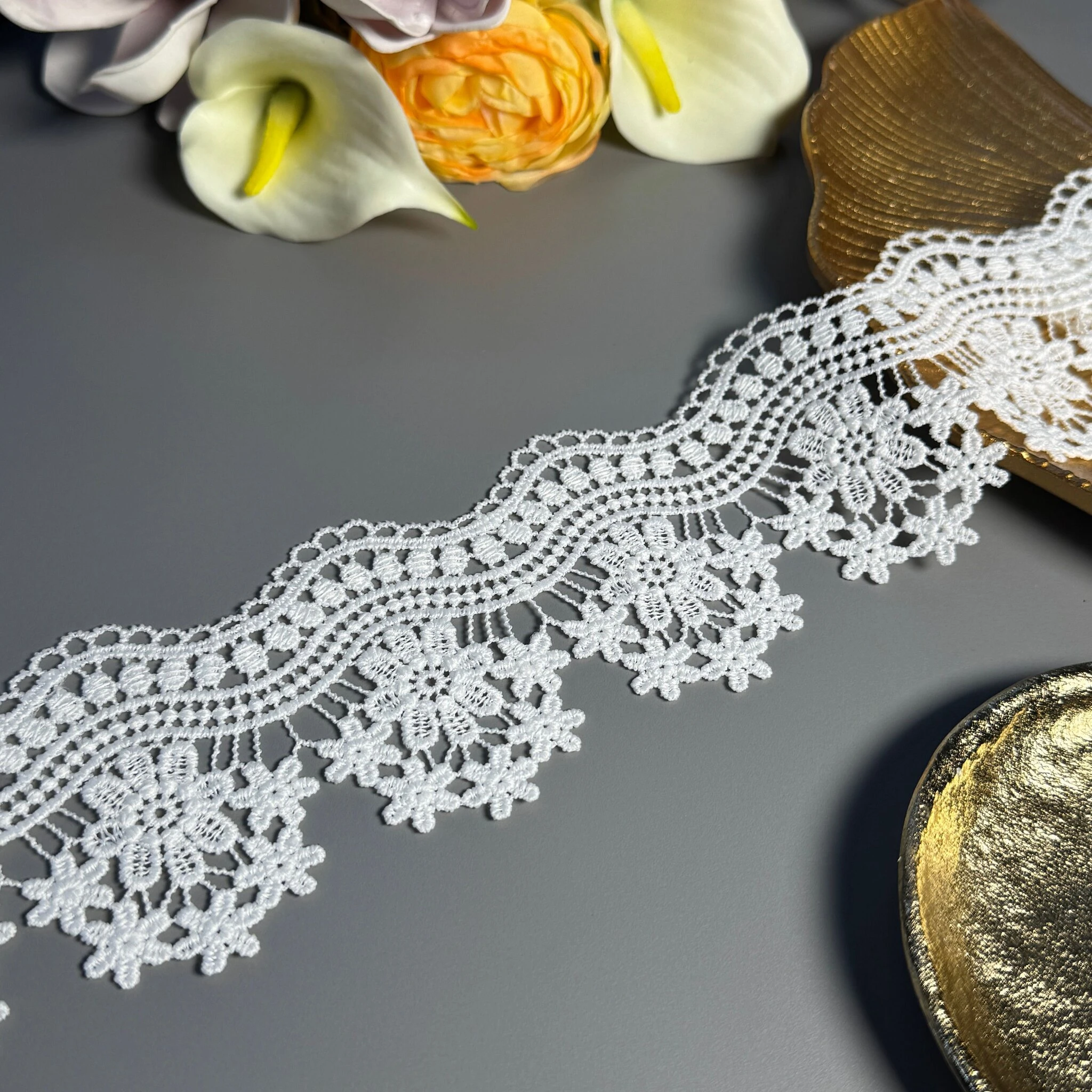 Кружево полиэстер – декоративный материал из синтетического волокна, который отличается высокой износостойкостью и стабильностью формы. Полиэстер не склонен к деформациям, не растягивается и не мнется, что делает кружево пригодным для частого использования.